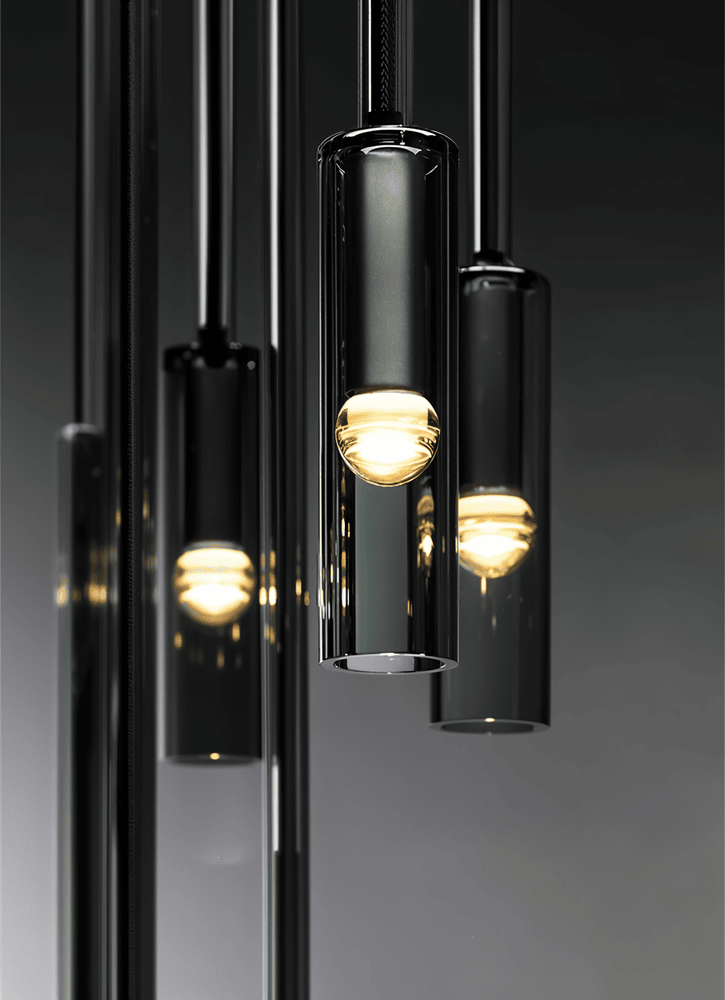 Den eleganta, cylindriska designen i kombination med det industripunkinspirerade, svarttonade glaset skapar en slående fokuspunkt i alla rum.