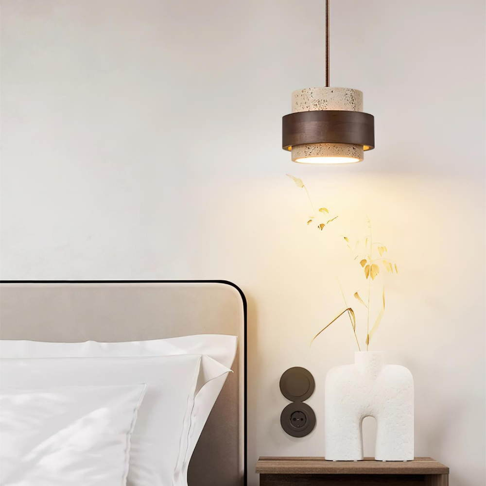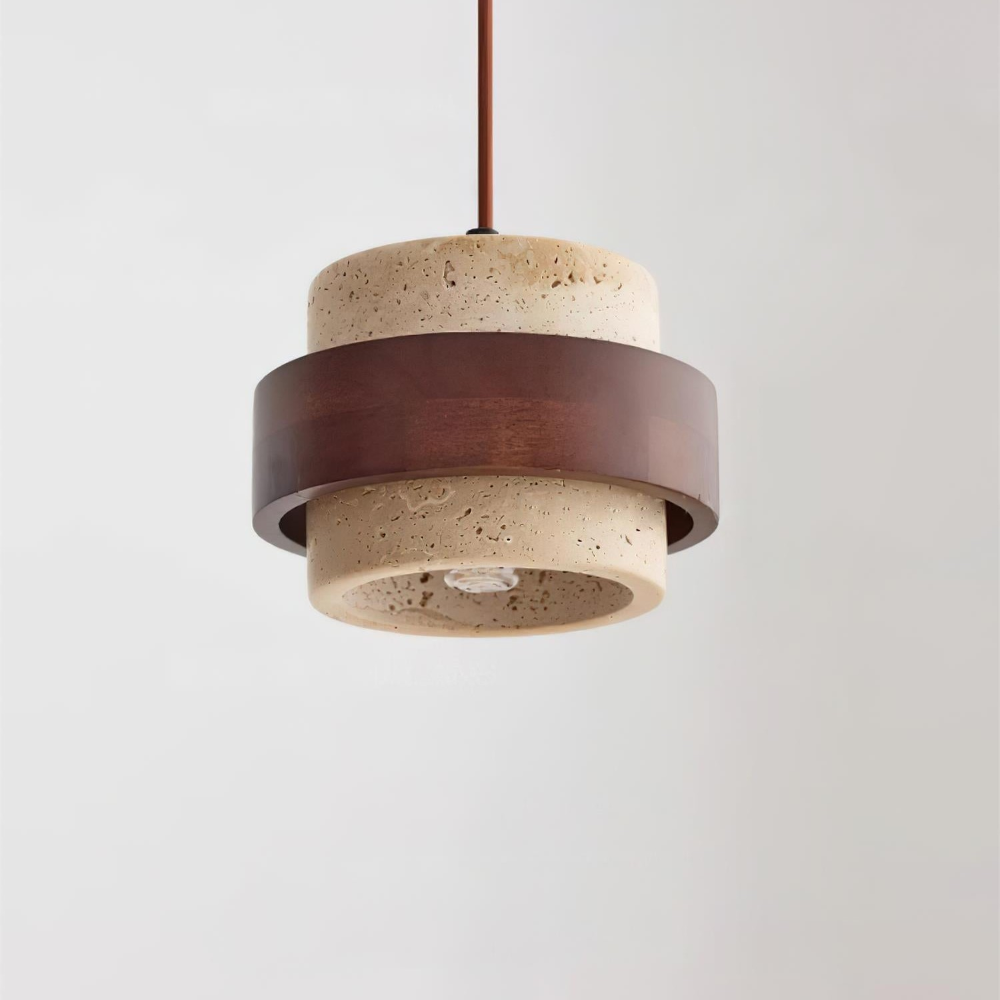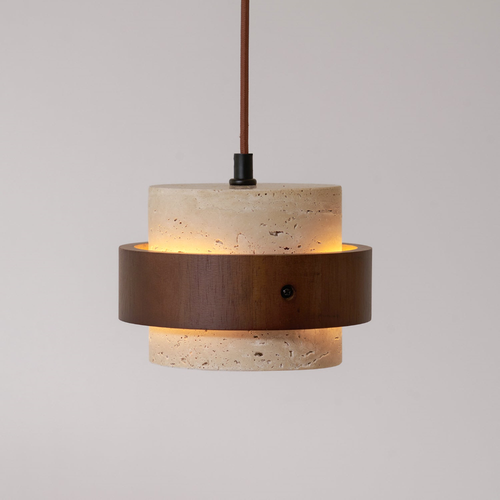 Stilig pendellampa + naturtravertinskärm, valnötsträ, 17 cm i diameter.
