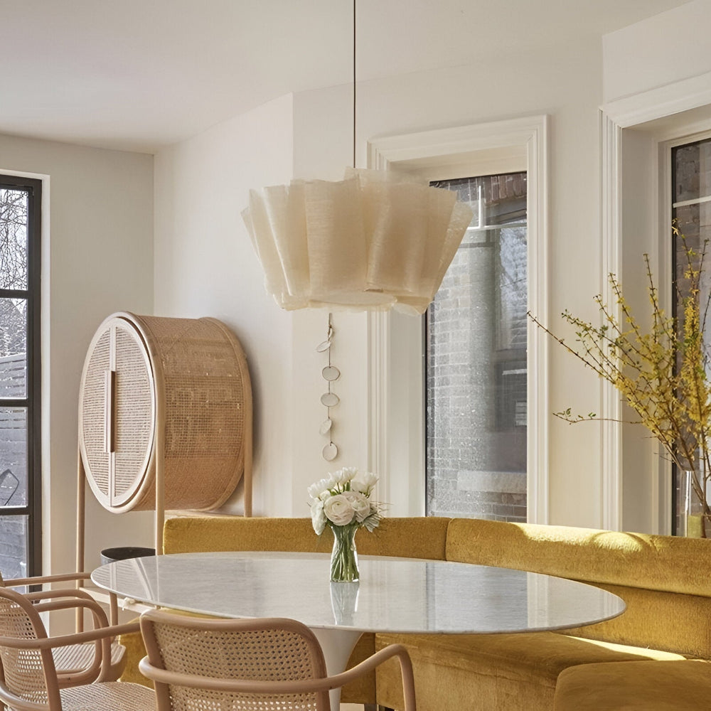 Elegant pendellampa i japansk stil + handstickad tygsärm, minimalistisk design, idealisk för mysiga rum.